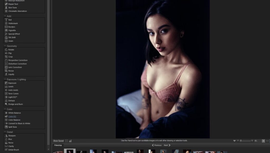 ACDSee Photo Studio's redigeringstilstand (Edit mode) er hjertet i programmets kreative muligheder. Her finder man en bred vifte af pixelbaserede funktioner, der giver brugeren kontrol over billedets enkelte pixels. Dette inkluderer værktøjer til effekter, maskering, tekstoverlejring og vandmærker. Venstre panel i redigeringstilstanden indeholder en lang liste over disse værktøjer. Her kan man finde indstillinger for korn (grain), tilt-shift og vandmærker, samt en sektion for specialeffekter, der åbner op for ni forskellige filtertyper, herunder kunstnerisk, forvrængning, maleri og retro.