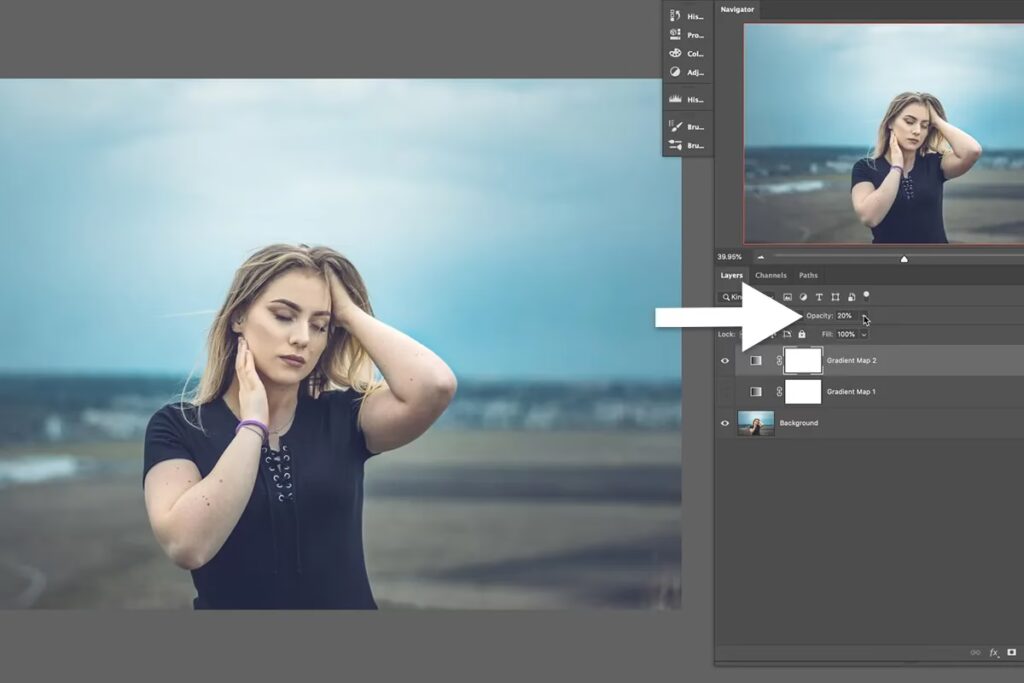 En meget kraftfuld og non-destruktiv metode er at anvende en gradient på en lagmaske eller en vektormaske. Sort skjuler, hvid afslører, og gråtoner skaber delvis gennemsigtighed. Ved at tegne en gradient på en maske (f.eks. fra sort til hvid), kan du gradvist afsløre eller skjule dele af laget, hvilket er perfekt til overgange mellem billeder eller til at fjerne en baggrund gradvist.