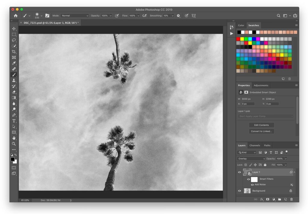 - Fleksibelt: Du kan nemt justere støjens intensitet ved at ændre lagets opacitet.