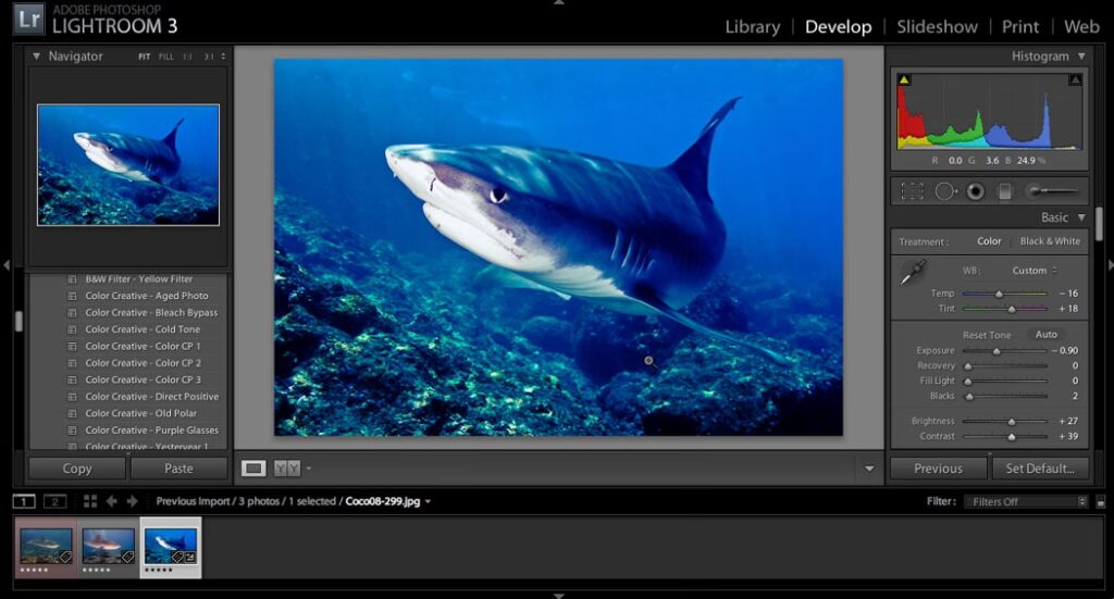 Lightroom er fremragende til grundlæggende og avancerede justeringer som eksponering, kontrast, hvidbalance, farvemætning, skarphed, støjreduktion og tonekurver. Det tilbyder også effektive værktøjer til beskæring, justering af perspektiv og mindre lokal justering med pensler eller graduerede filtre. Programmet er bygget til effektivt at håndtere store biblioteker af fotos, hvilket gør det nemt at sortere, bedømme, tagge og søge i tusindvis af billeder.