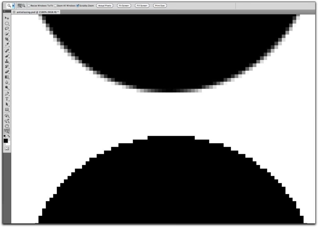Forestil dig at tegne en cirkel med store legoklodser på et fladt underlag. Kanterne på cirklen vil ikke være glatte, men i stedet have en trinvis form, der afspejler klodsernes firkantede natur. Dette er i bund og grund, hvad aliasing er på pixelniveau. Jo lavere opløsningen er, og jo skarpere kontrast der er mellem linjen og baggrunden, desto mere udtalt vil trappeeffekten være.