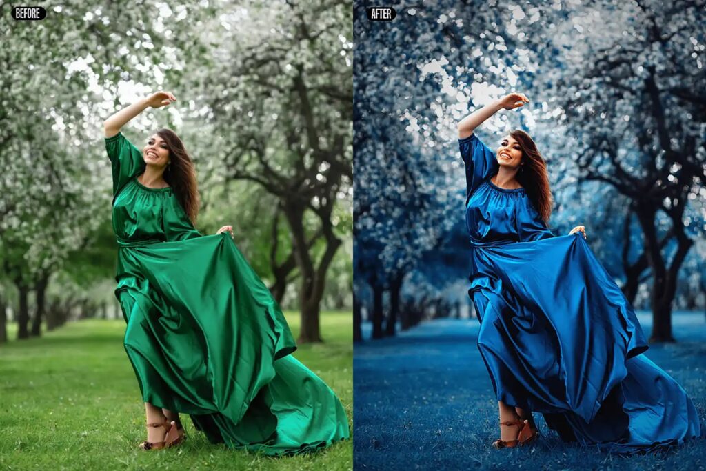 Du kan øge mætningen for at få farven til at springe frem, justere lysstyrken for at gøre den mørkere eller lysere, eller endda ændre dens nuance let for at gøre den mere grønlig (mod teal) eller mere blålig (mod himmelblå). Farvegradering, der inkorporerer vandblå i højlys eller skygger, kan give billeder et drømmende, køligt eller vintage-agtigt udseende. For eksempel kan en let vandblå toning i skyggerne på et portræt give billedet en ren og frisk følelse.