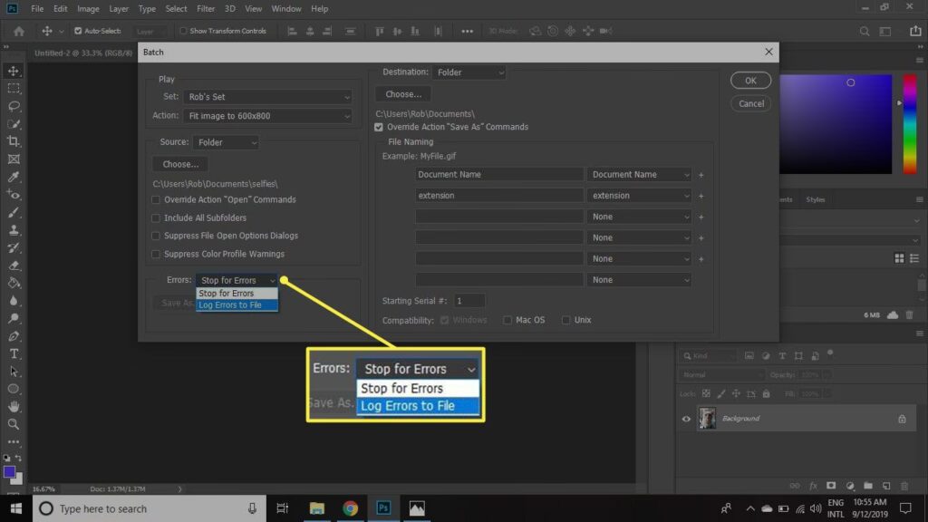 Nu, hvor du har en handling, der kan placere et print i én specifik ramme og gemme resultatet, kan du bruge Batch-kommandoen til at anvende denne handling på alle dine 600+ printbilleder.