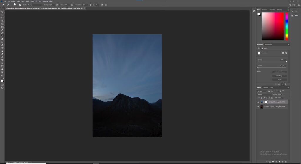For at markere bjerge mod en himmel, som foreslået i et af eksemplerne, ville Hurtigt markeringsværktøj ofte være et godt sted at starte. Du kan enten markere bjergene direkte eller markere himlen og derefter invertere markeringen (Vælg > Inverter - Select > Inverse) for at få bjergene valgt. Efter den indledende markering er Vælg og Maskér værktøjet til at forfine kanterne, især hvis der er komplekse overgange som træer eller klipper.