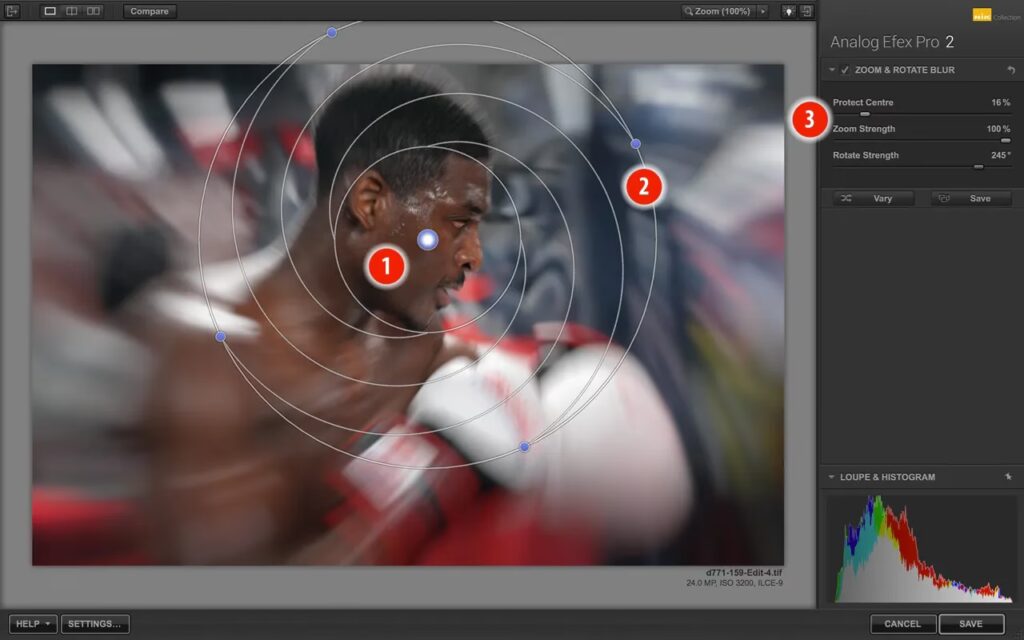 Under indstillingerne for sløring finder du også "Bokeh"-indstillinger. Bokeh refererer til den æstetiske kvalitet af de ude-af-fokus områder i et billede, især hvordan lyskilder gengives som slørede cirkler eller polygoner. Du kan vælge mellem forskellige bokeh-former, der simulerer forskellige linsedesigns (f.eks. cirkel, trekant, firkant, pentagon, hexagon). Valget af bokeh-form kan have en betydelig indvirkning på det færdige billedes udseende og stemning, især i scener med mange små lyskilder i baggrunden.