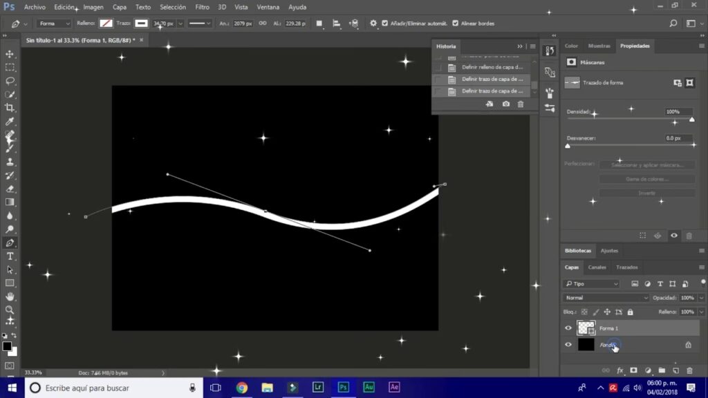 Når du tegner en form med Form-indstillingen, får den automatisk en fyldfarve og potentielt en Kontur (Stroke) baseret på de indstillinger, der er valgt i indstillingslinjen eller panelet Egenskaber (Properties). Du kan definere disse indstillinger før eller efter, du tegner formen (så længe formlaget er valgt).