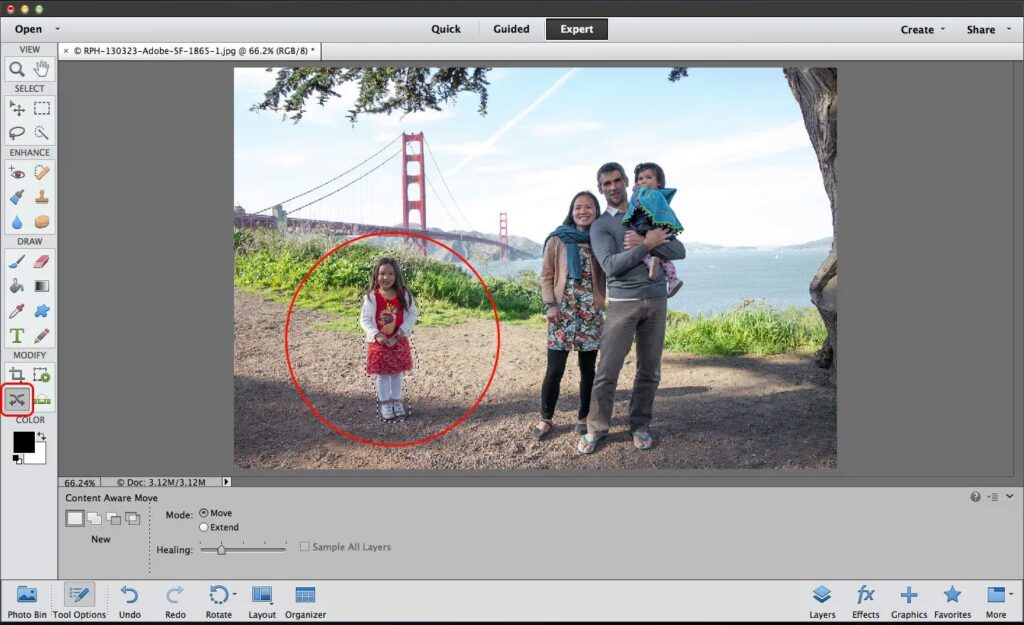 Værktøjet er særligt nyttigt til at finjustere kompositioner efter optagelsen. Måske er en person i en gruppefoto placeret lidt for langt til højre, eller et element distraherer i kanten af billedet, men ville passe bedre, hvis det blev flyttet tættere på hovedmotivet. Content-Aware Move gør det muligt at eksperimentere med placering uden at skulle starte forfra med komplekse lag og masker.