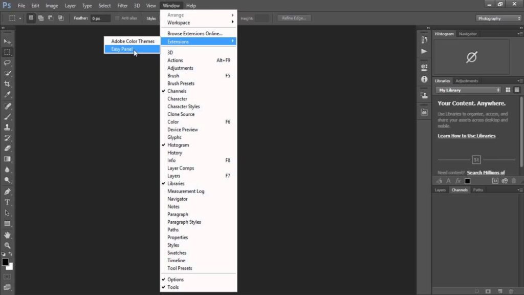 Det første skridt til at bruge et panel er at finde det. Photoshop organiserer sine paneler i forskellige områder på skærmen, ofte i en 'Panel Bin' eller dokket langs kanten. Hvis et panel ikke er synligt, skal du vide, hvordan du kalder det frem.