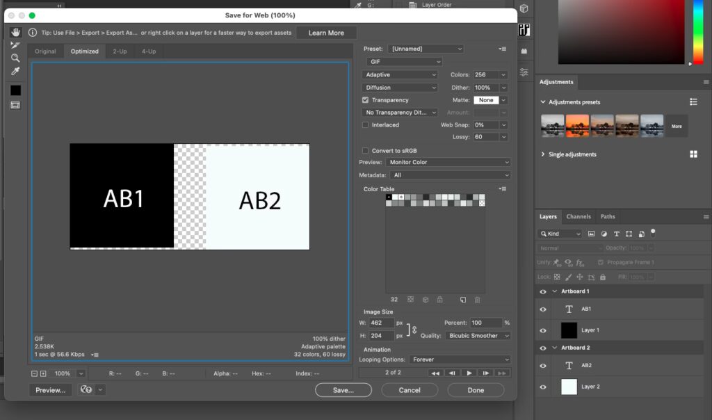 Photoshop eksporterer baseret på det synlige indhold. Ved at skjule de andre artboards sikrer du, at 'Gem til web (ældre)' kun behandler og eksporterer indholdet fra det specifikke artboard, du ønsker som din GIF-fil.