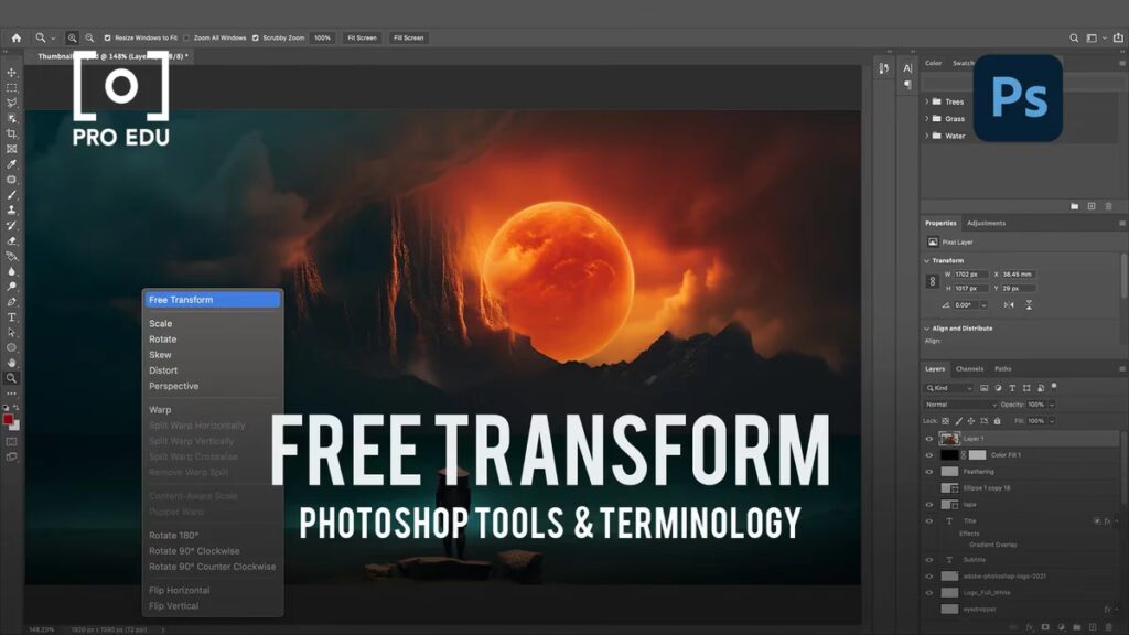 - Via hovedmenuen: Gå til Rediger > Fri Transformering (Edit > Free Transform)