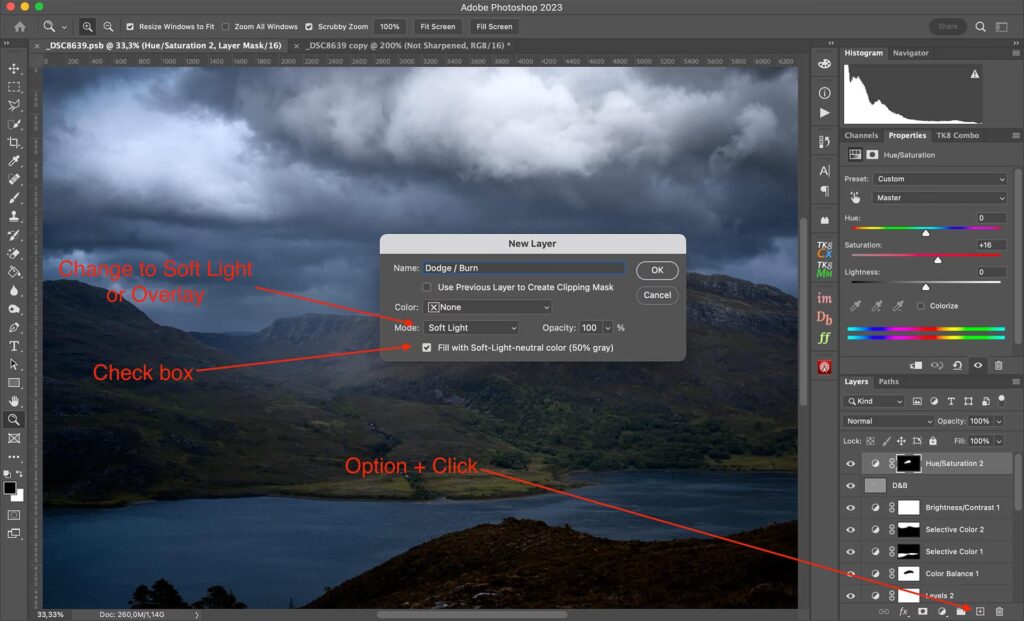 Selvom du kan bruge Dodge og Burn direkte på dit billedlag, anbefales det kraftigt at bruge en ikke-destruktiv metode. Den mest almindelige og fleksible metode er at bruge et neutralt gråt lag: