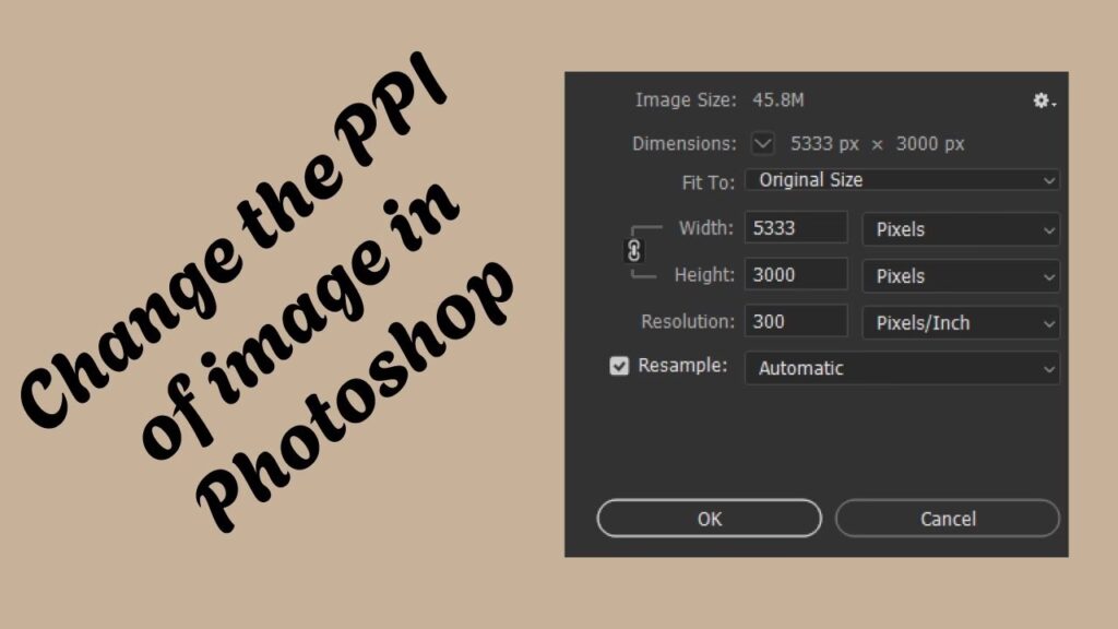 - I dialogboksen for billedstørrelse vil du se felter for bredde, højde og opløsning (resolution), som typisk er målt i PPI eller Pixels/Inch.