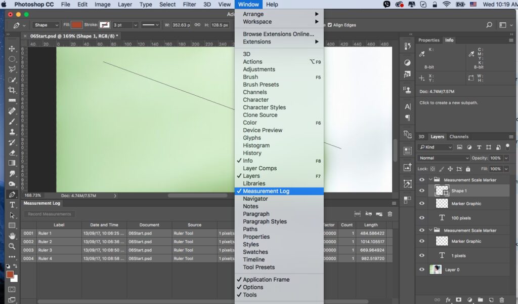 Den mest almindelige anvendelse er at måle afstande. Du skal blot vælge Måleværktøjet fra værktøjspanelet (det er typisk gemt bag Pipetteværktøjet) og derefter klikke og trække hen over det område, du vil måle. I Indstillingslinjen (Options bar) øverst på skærmen samt i Infopanelet (Info panel) vil du straks kunne se information om længden af linjen, vinklen i forhold til den vandrette akse, samt start- og slutkoordinaterne.