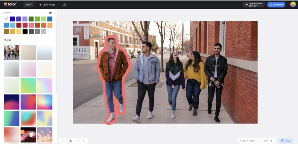 Vælg laget med billedet af dig selv. Her kommer baggrundsfjernelsesværktøjet ind i billedet. Mange online værktøjer tilbyder nu AI-drevet baggrundsfjernelse, der automatisk detekterer personen på billedet og fjerner alt omkring dem. Dette sparer enormt meget tid sammenlignet med manuel markering. Selvom AI er god, er den ikke altid perfekt. Derfor tilbyder de bedste værktøjer også manuelle justeringsmuligheder, så du kan finjustere masken med en pensel for at tilføje eller fjerne områder, der blev fejlagtigt inkluderet eller udeladt. Når baggrunden er fjernet, står du tilbage med en fritlagt version af dig selv.