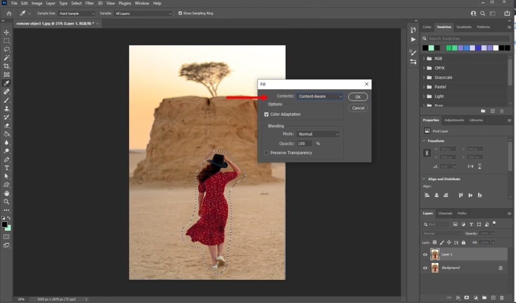 - Når du slipper museknappen (eller løfter pennen fra tabletten), vil Photoshop behandle det markerede område. Værktøjet analyserer de omkringliggende pixels og genererer indhold til at erstatte det markerede objekt. Du vil se objektet forsvinde og blive erstattet af nyt indhold, der forhåbentlig blander sig sømløst med resten af billedet.