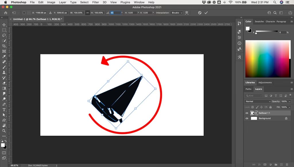 - Du vil nu opdage, at rotationen 'snapper' til bestemte trin. Baseret på den information, vi har, er standardtrinnet ofte 15 grader. Dette betyder, at elementet kun roterer i intervaller på 15, 30, 45, 60, 75, 90 grader osv.