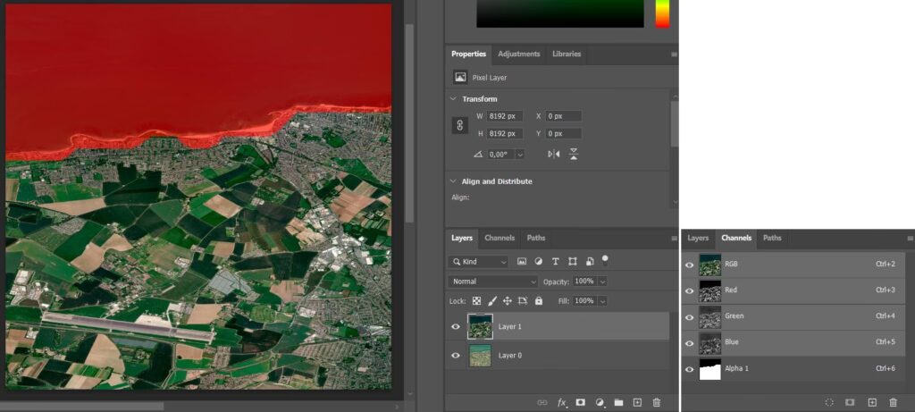 Alfakanaler gemmes i Kanalpanelet sammen med de synlige farvekanaler (Rød, Grøn, Blå i et RGB-billede). De er en del af billedfilen, når du gemmer i formater, der understøtter kanaler, som f.eks. PSD eller TIFF.