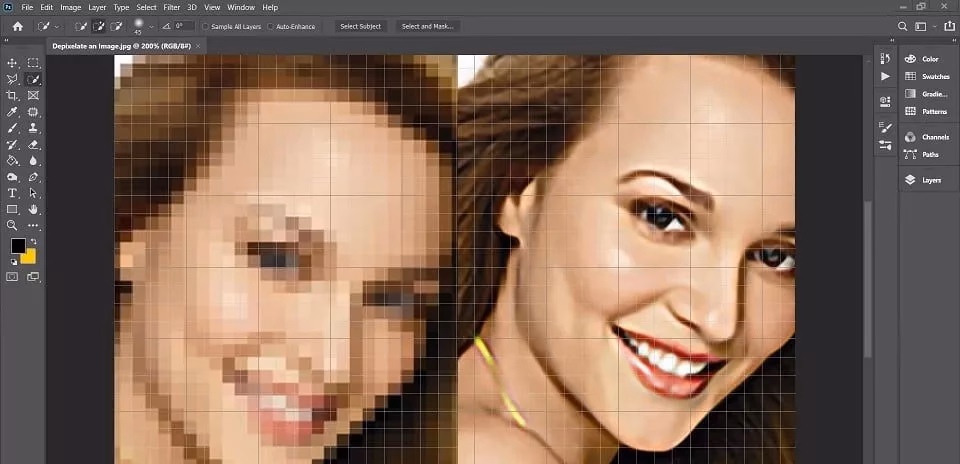 Standard billedredigeringsprogrammer som Adobe Photoshop tilbyder værktøjer, der kan hjælpe med at mindske synligheden af pixelering. Det er vigtigt at forstå, at disse metoder primært udjævner billedet i et forsøg på at skjule de hakkede kanter, men de genskaber ikke reelt tabte detaljer. I mange tilfælde kan de faktisk gøre billedet sløret: