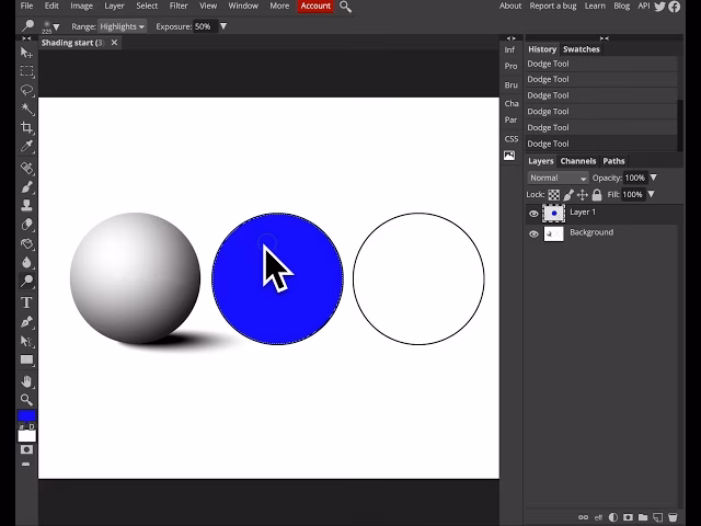Eksponering styrer intensiteten af mørkningseffekten. En højere eksponeringsprocent mørkner området mere med hvert strøg, mens en lavere procent mørkner det mindre. Lavere eksponering giver mere kontrol og mulighed for at opbygge effekten gradvist.
