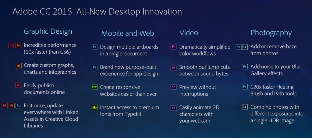Hver ny version af Creative Suite indeholdt opdaterede versioner af Adobes kerneprogrammer som Photoshop, Illustrator, InDesign, Premiere Pro og After Effects, samt nye funktioner og forbedringer. CS6 blev udgivet i maj 2012 og var den sidste version, der blev solgt under Creative Suite-navnet og med en evig licens. Det var kulminationen på Adobes traditionelle softwaremodel.