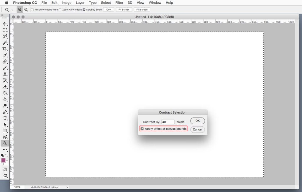 - Det er en kommando under menuen Markér > Ændr, der lader dig skrumpe grænserne for en aktiv markering indad med et specificeret antal pixel. Dette bruges typisk til at fjerne uønskede pixel fra baggrunden, der er kommet med i den indledende markering.