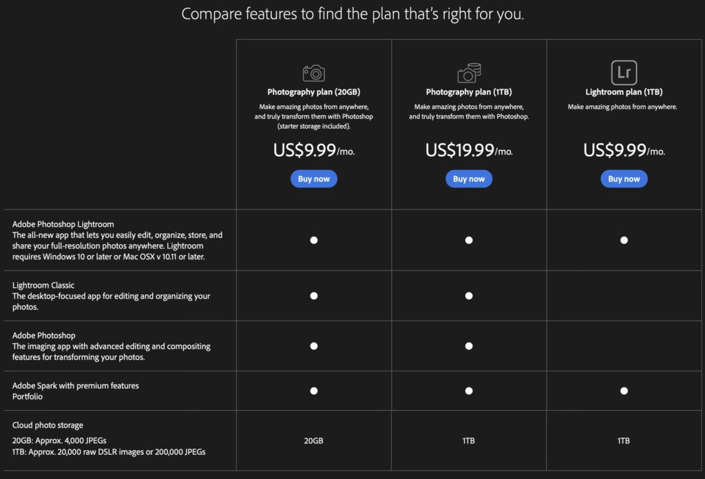 Abonnenter har kunnet vælge mellem to abonnementer til samme pris, 11,89 euro hver: enten Lightroom, Lightroom Classic og Photoshop plus 20 GB cloud-lagerplads, eller kun Lightroom og 1 TByte cloud-lagerplads. Den primære forskel på disse to muligheder har været, at Lightroom Classic ikke er inkluderet i solo-versionen for Lightroom CC (som det kaldes i teksten). Hvis man ønskede at bruge alle tre programmer og den store online diskplads, var prisen 23,79 euro per måned.