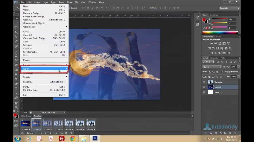 - At åbne Tidslinje-panelet (Window > Timeline). Her kan man vælge at oprette enten en 'Frame Animation' eller en 'Video Timeline'. Til mere flydende bevægelse og brug af teknikker som løgskind, er Video Timeline ofte foretrukket.