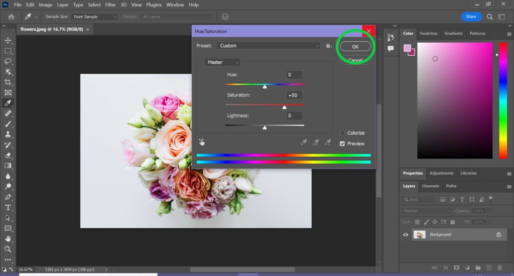 Værktøjet Nuance/Mætning (Hue/Saturation)