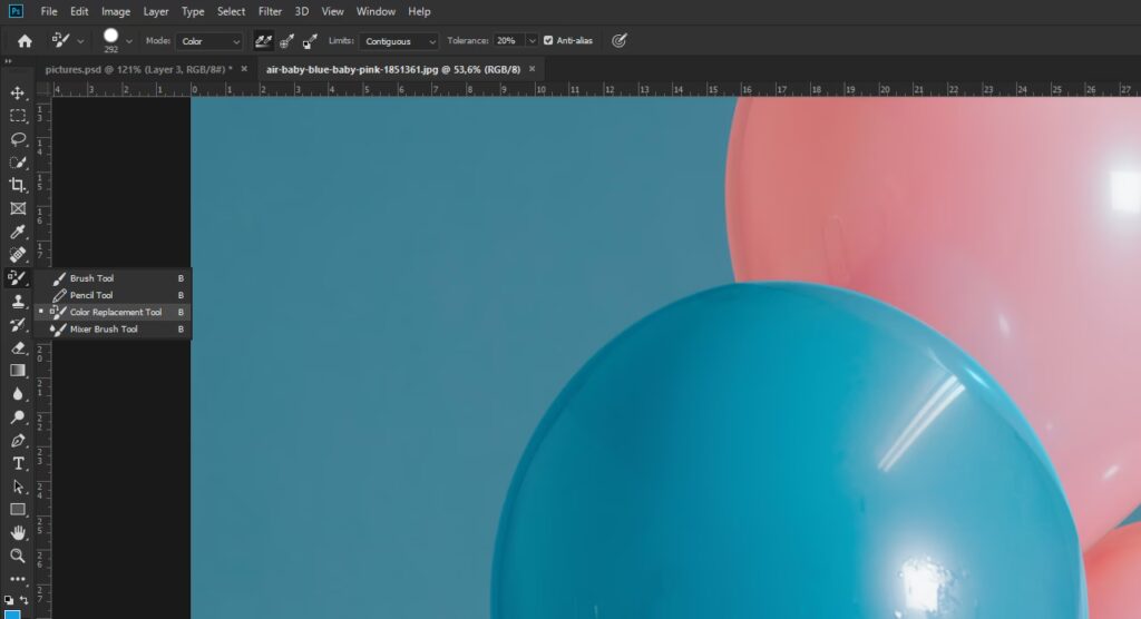 Lad os sige, vi vil ændre farven på en blå ballon, der har en baggrund med lignende blå nuancer. Vi vælger Farveerstatningsværktøjet, vælger en ny farve (f.eks. grøn) som forgrundsfarve, sætter Tilstand til 'Farve', Sampling til 'Kontinuerlig', Begrænsninger til 'Find kanter' og en lav Tolerance (f.eks. 20-30%).